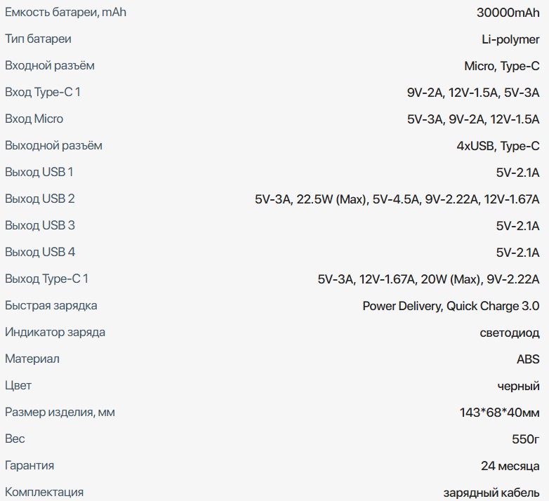 | Емкость | 30000 мА*ч |