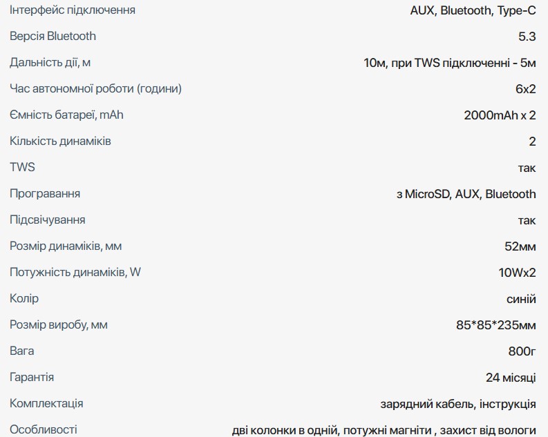Благодаря версии Bluetooth 5.3, она обеспечивает стабильное подключение на расстоянии до 10 метров, а в режиме TWS - до 5 метров, что позволяет наслаждаться свободными движениями во время прослушивания музыки. С двумя встроенными динамиками диаметром 52 мм и мощностью 10 Вт каждый, эта колонка дает многогранный и насыщенный звук, который дополняется функцией TWS для создания стерео эффекта.