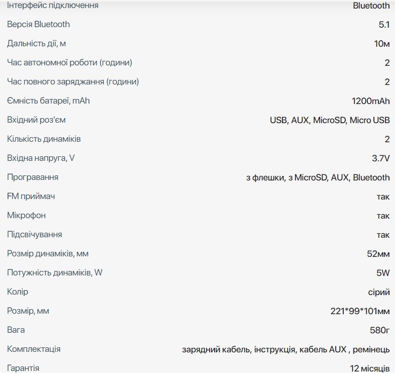Батарея ємністю 1200 мАг, дозволяє колонці працювати автономно протягом 2 годин.