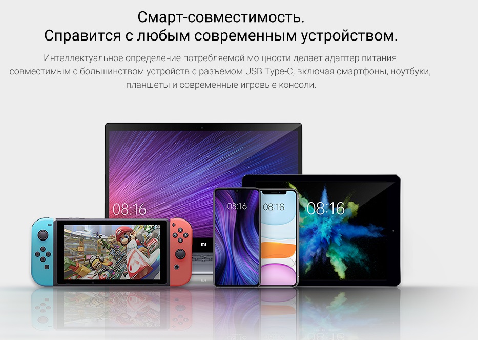 Выход: 5V / 3A, 9V / 3A, 12V / 2.25A, 20V / 1.35A, 11V / 3A