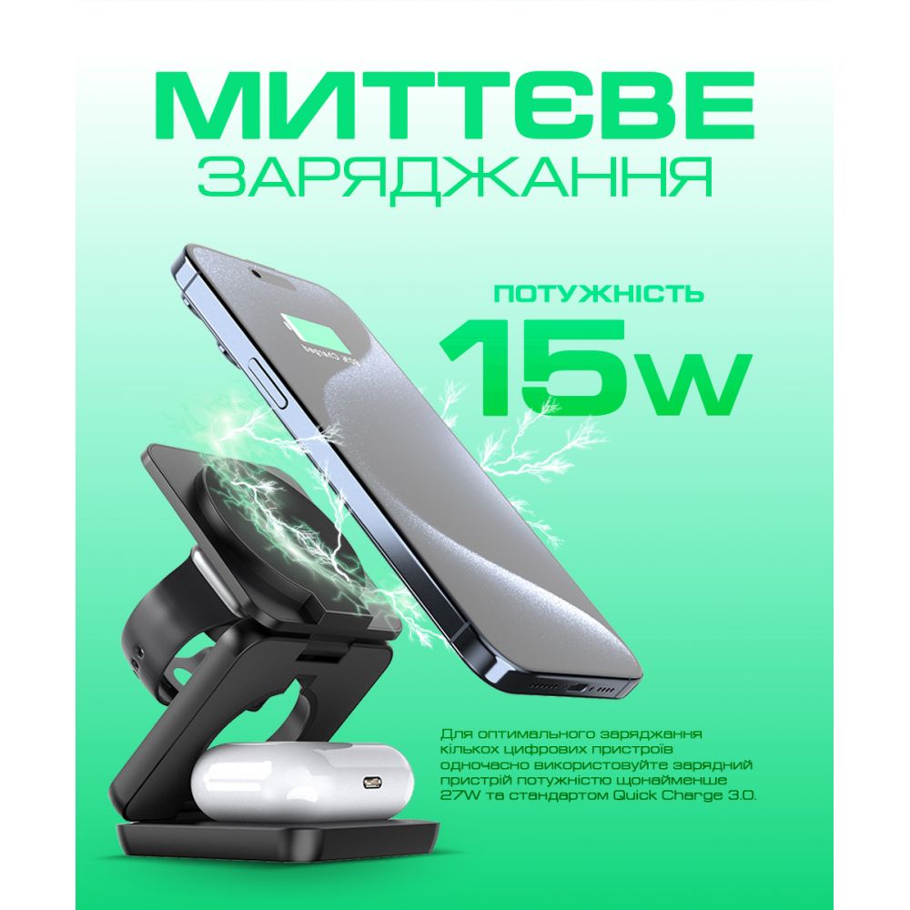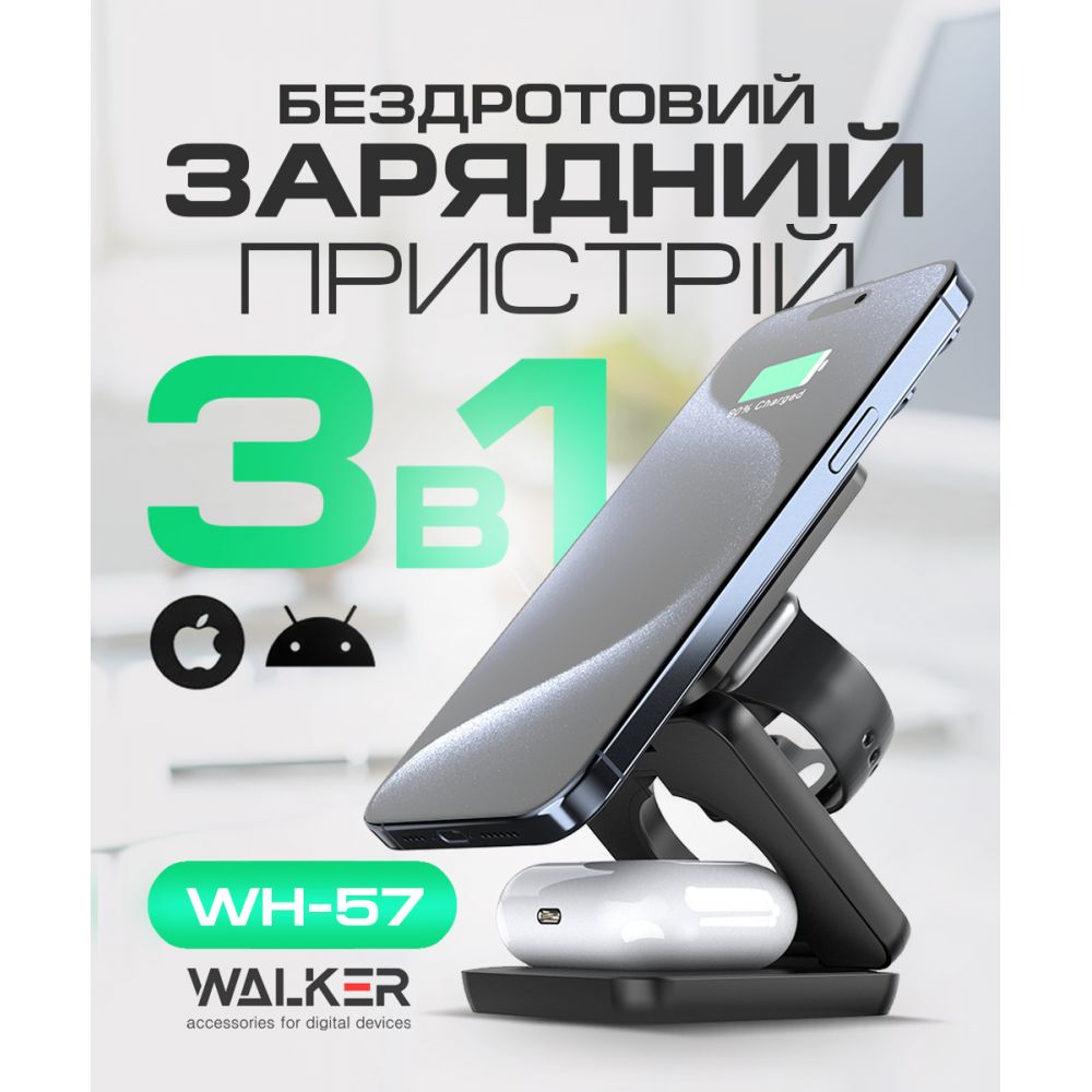Беспроводное зарядное устройство WALKER WH-57 3в1 15W, черный - 919220