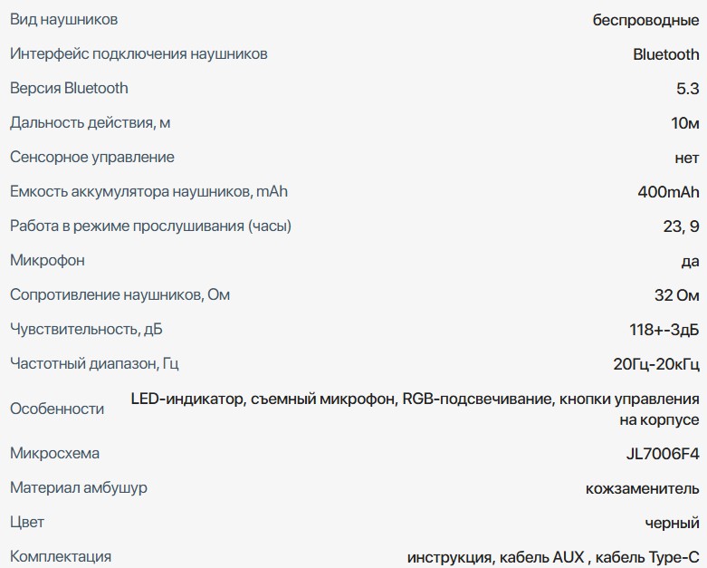 Встроенный Bluetooth 5.3 интерфейс позволяет беспроводно подключаться к разным устройствам на расстоянии до 10 метров, обеспечивая свободную подвижность. Благодаря большой емкости аккумулятора (400 mAh) наушники обеспечивают до 9 часов непрерывного прослушивания. Их высокая чувствительность (118±3 дБ) и широкий частотный диапазон (20 Гц – 20 кГц) обеспечивают поразительное качество звука с четкими деталями и глубокими басами. Материалы корпуса (пластик) и амбушур (кожзаменитель) обеспечивают комфорт и долговечность использования.