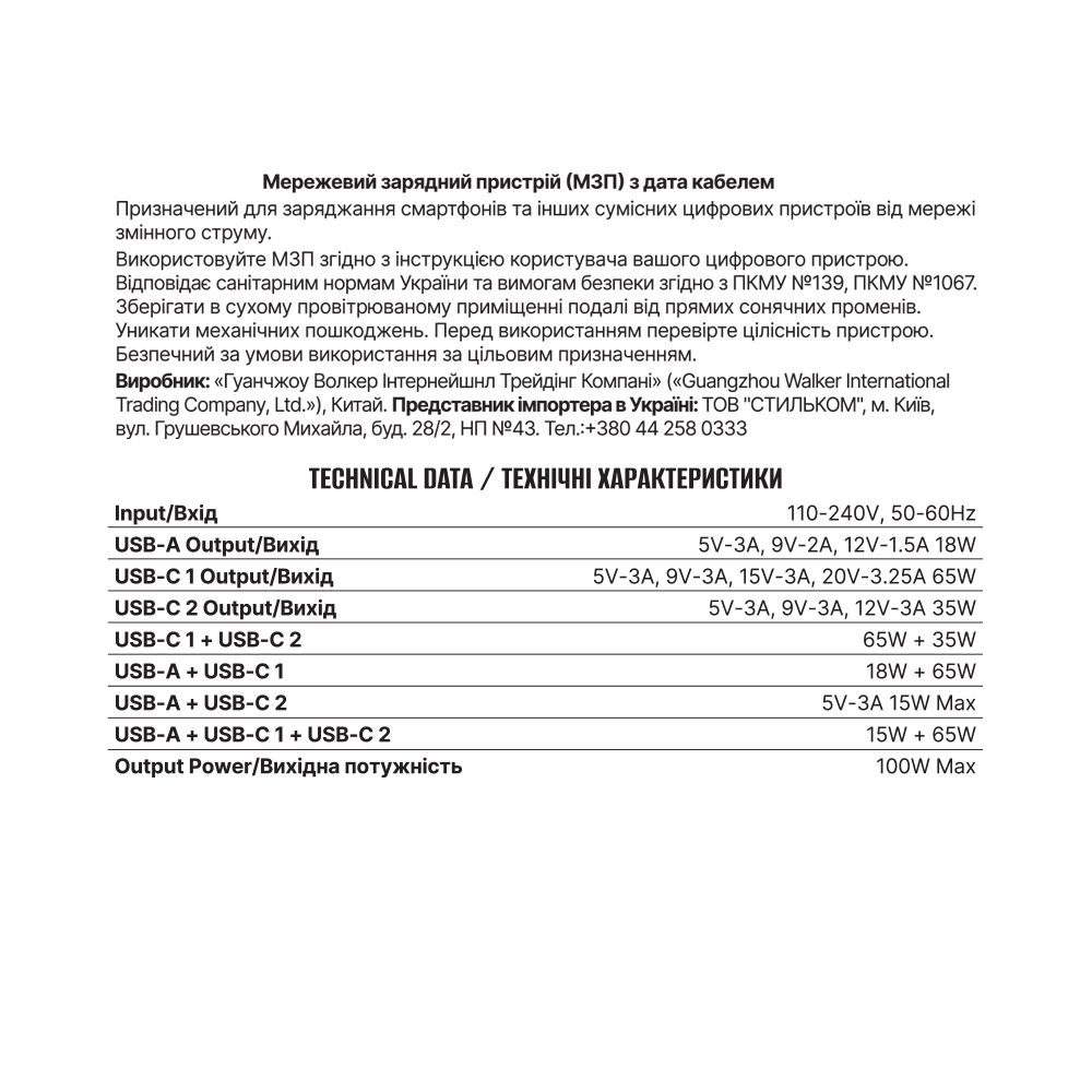 Сетевое зарядное устройство с быстрой зарядкой WALKER WH-47 (100w GaN PD 2USB-C/USB-A ports charger) black - 919256